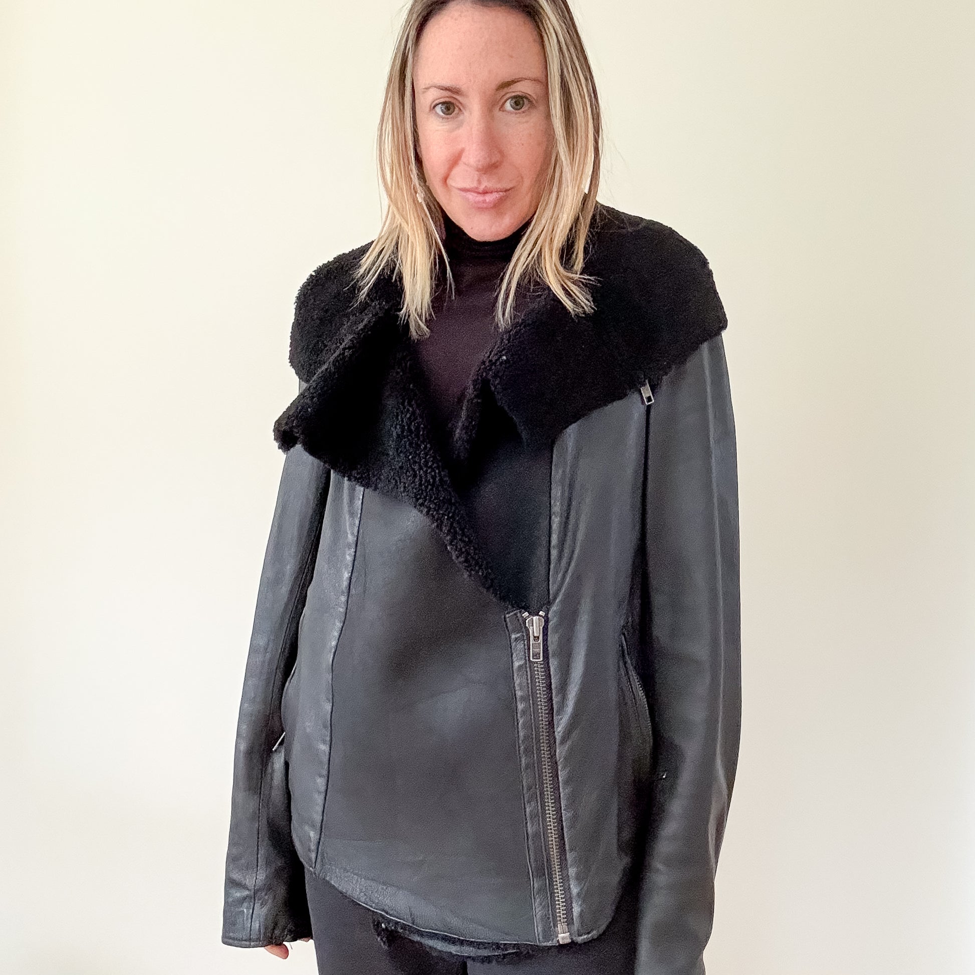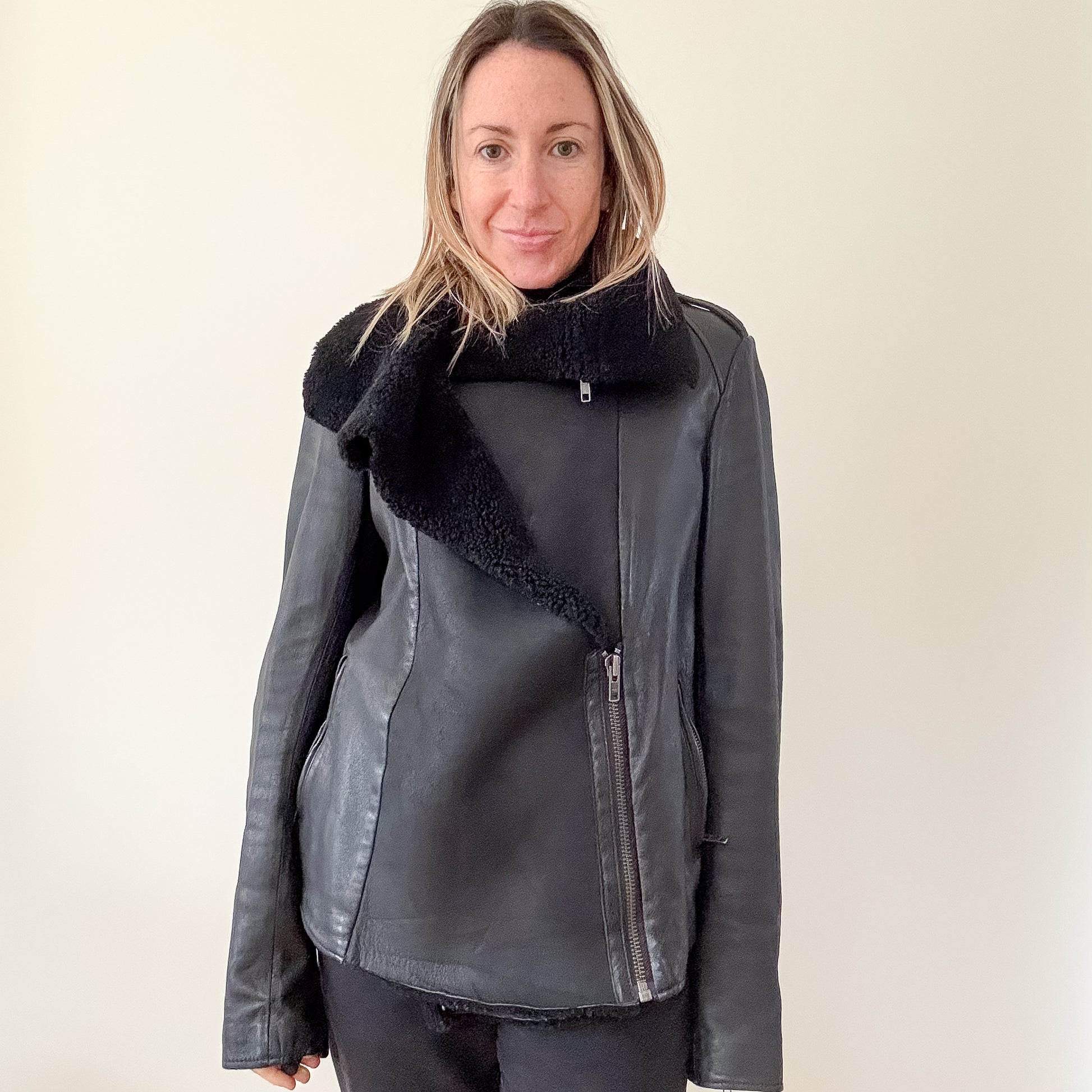 Cut in a flattering slim silhouette, the jacket features asymmetric zip closure, zipped cuffs, and angled front pockets that deliver classic moto appeal. The oversized shearling panel drapes naturally when open, creating striking texture contrast against the smooth leather. When fully zipped, it offers a structured, sculpted feel that’s both cosy and sharp.