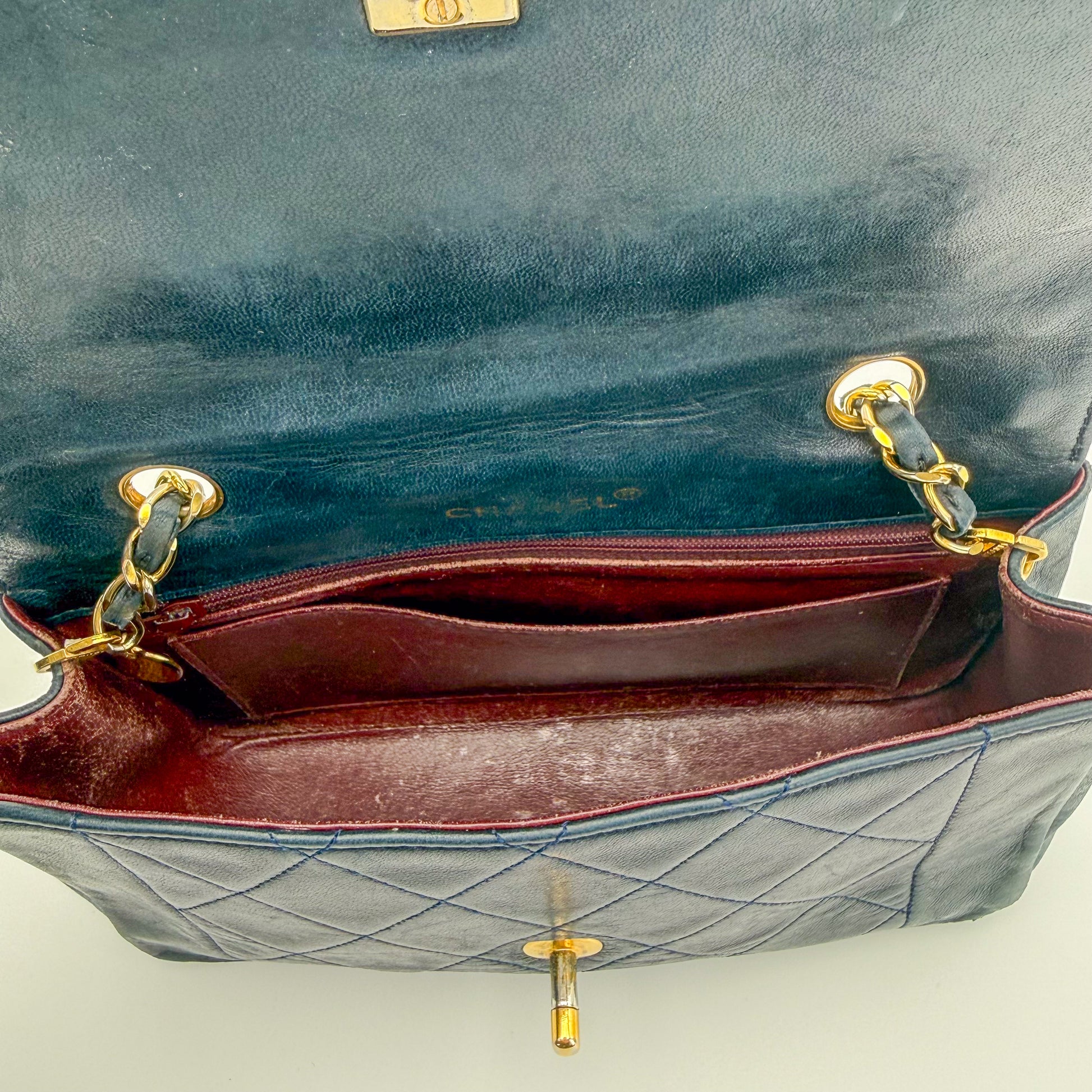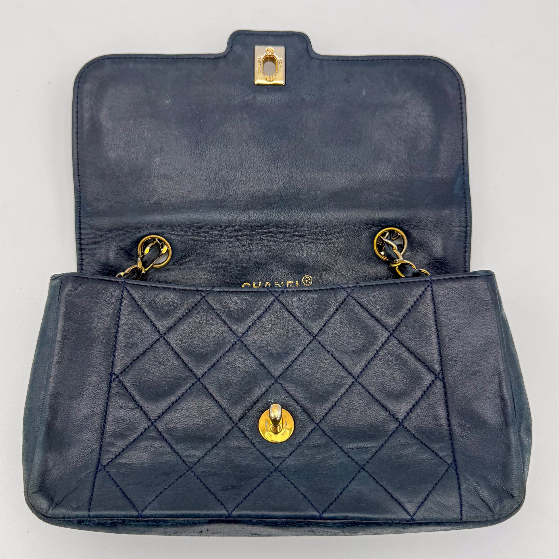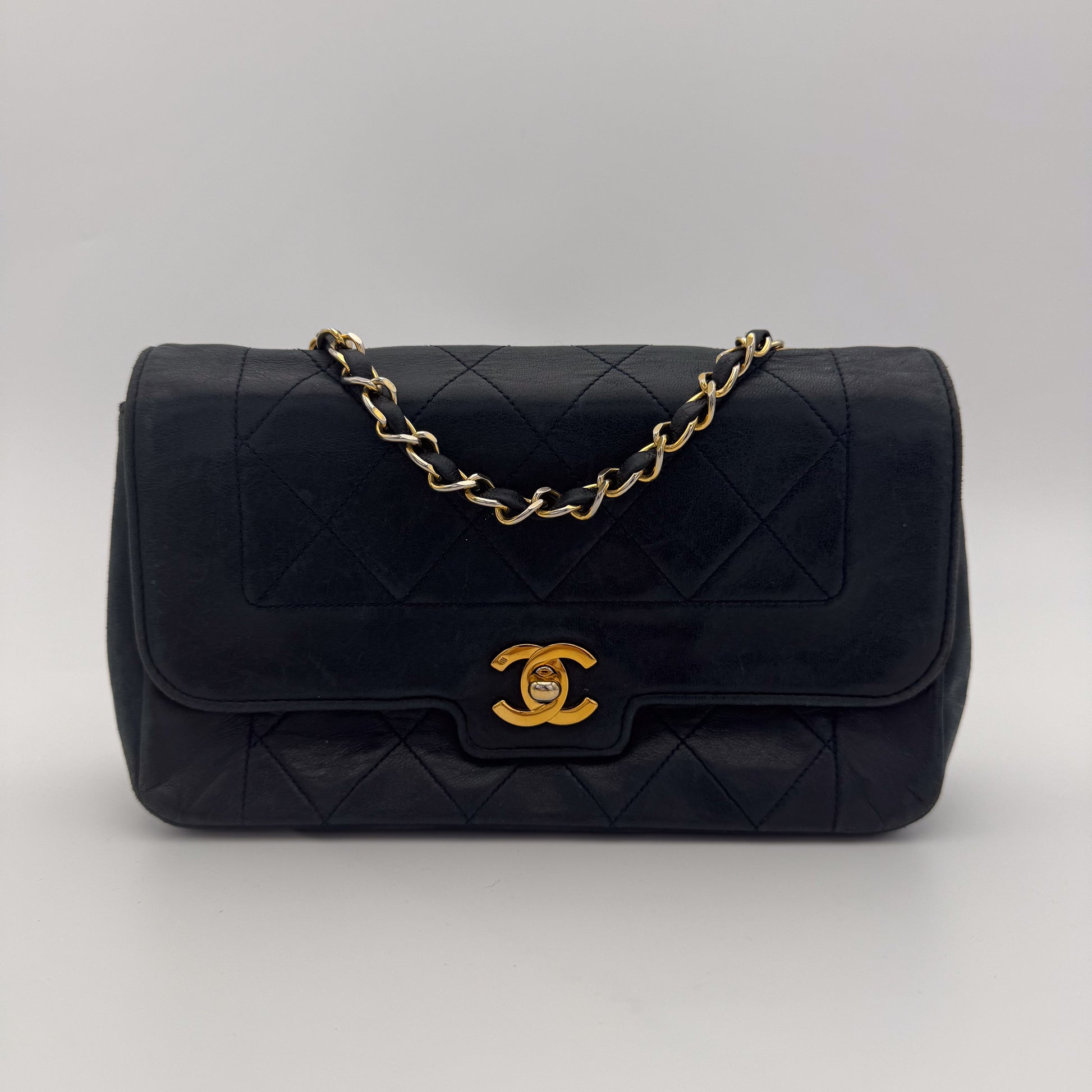 In a smooth leather dark navy blue, with contrasting two tone hardware this preloved Chanel Diana Flap is a forever classic. The soft smooth leather shows signs of wear, on the edges of the flap, corners of the bottom of the bag and side panels of the bag where the leather has crease lines.