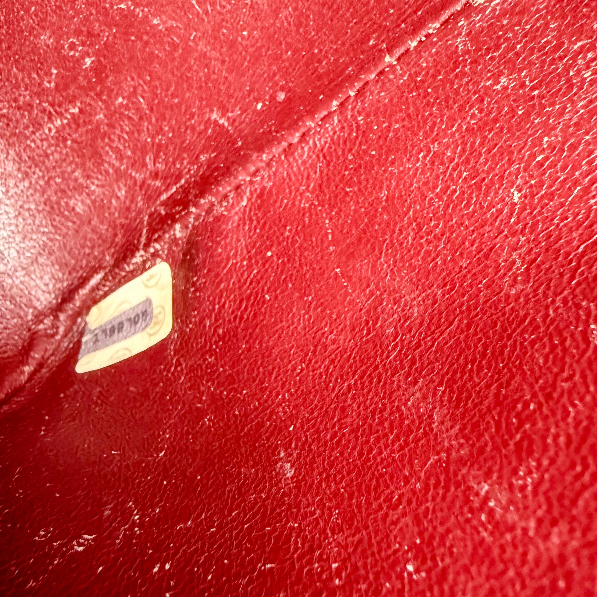The interior is a maroon colourway and shows signs of wear on the internal base of the bag where there is slight marking. The interior of the bag features one slim zip pocket, and one open slip pocket. The internal zip functions perfectly.