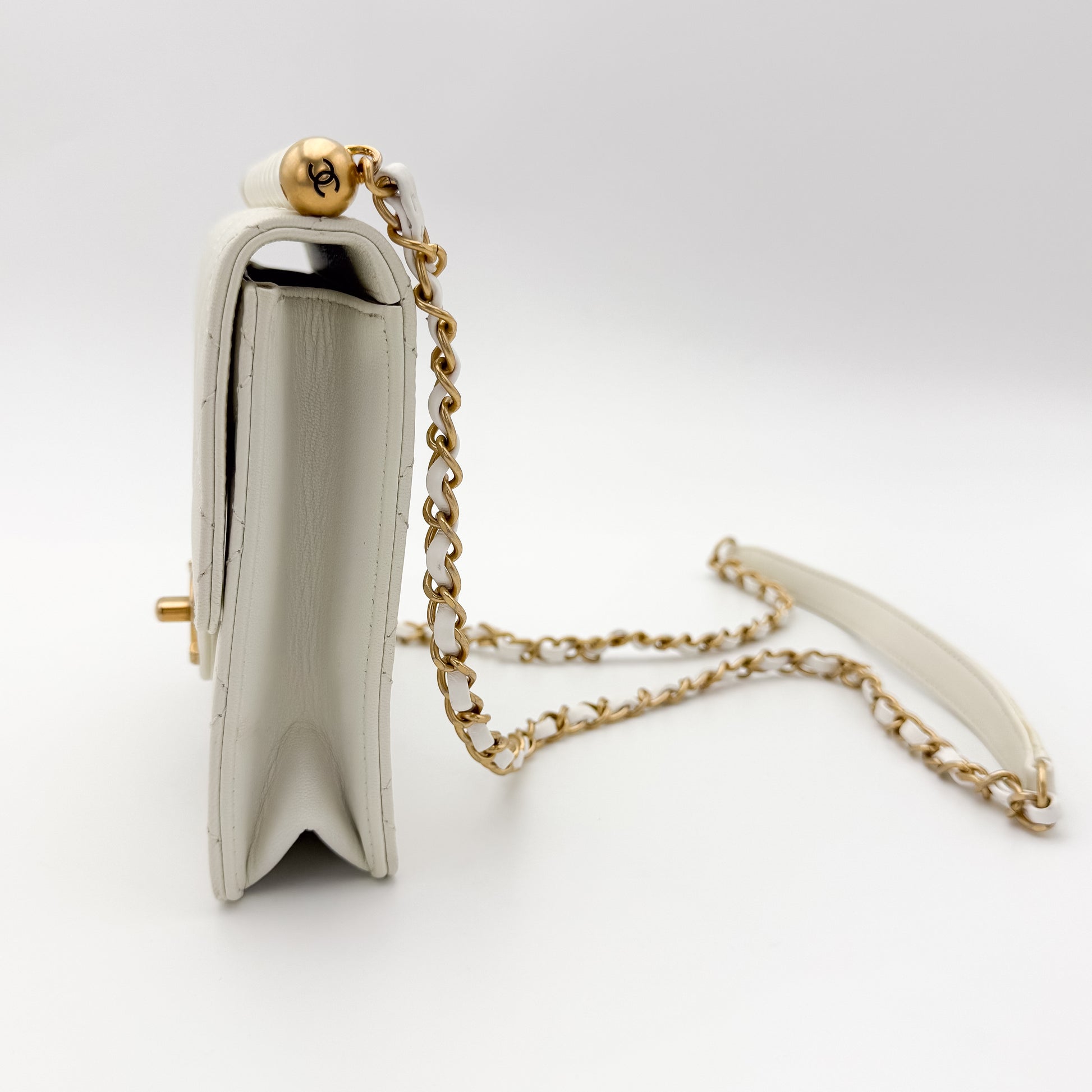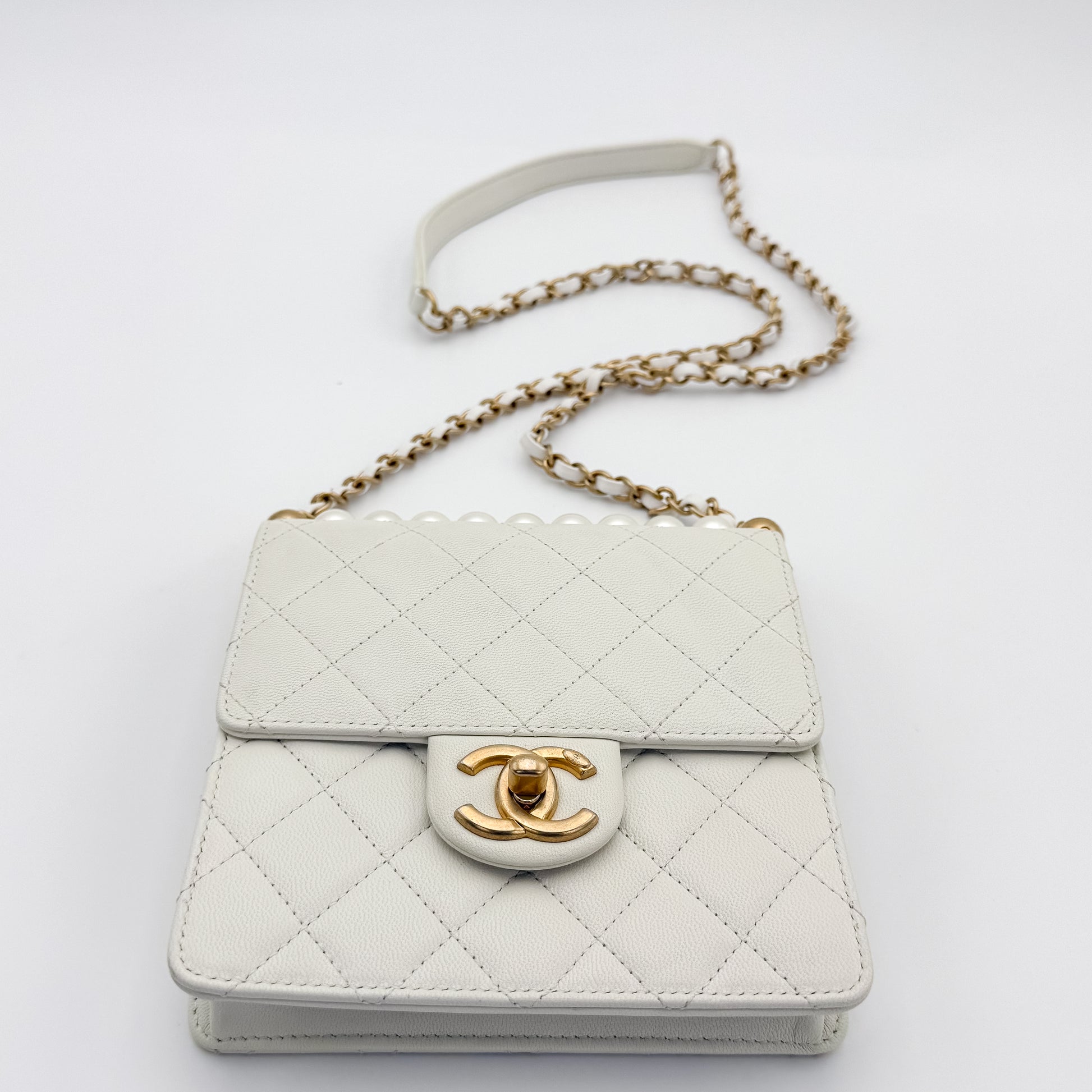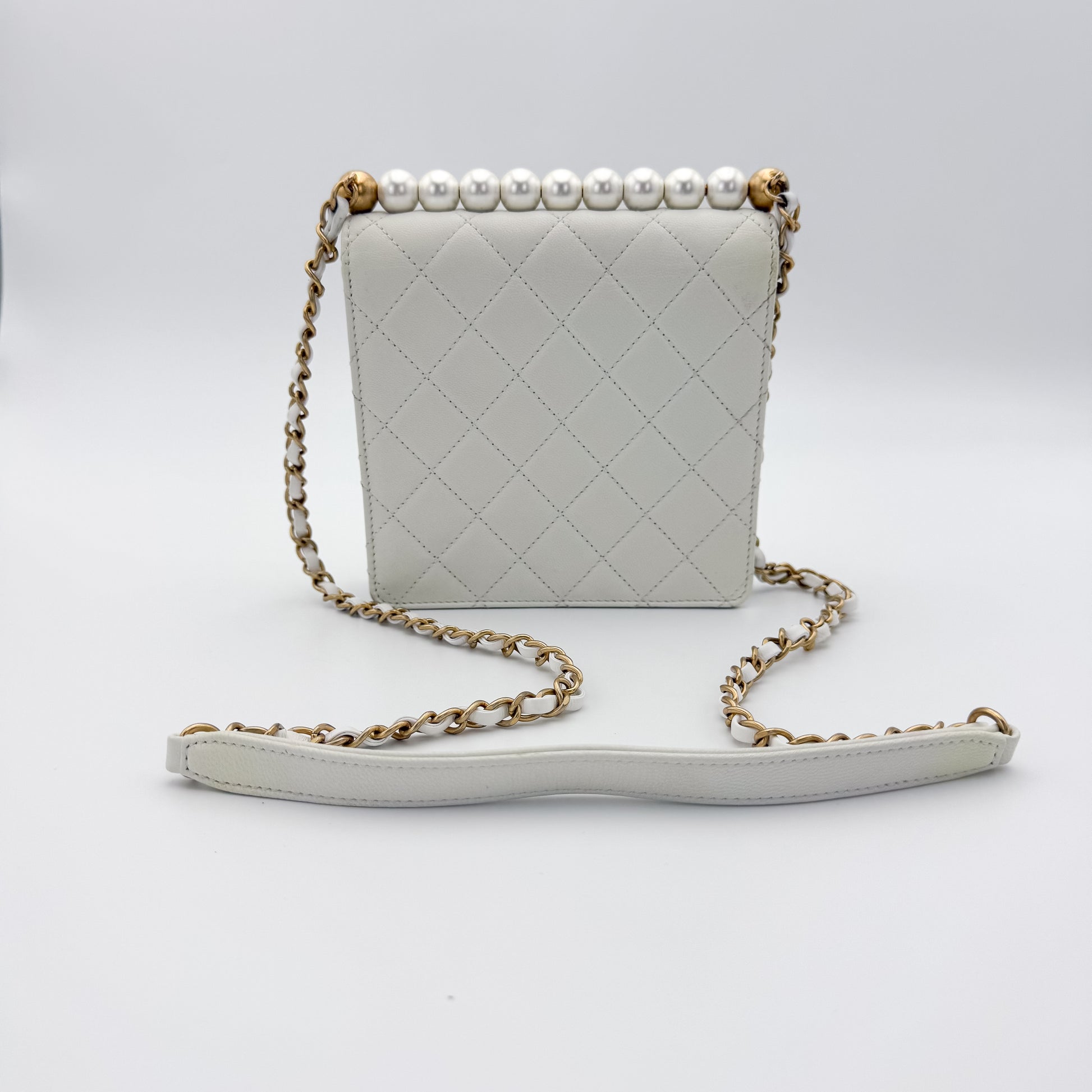 A rare and exquisite creation from the house of Chanel, this Vertical Pearl Flap Bag embodies the brand’s signature elegance with a contemporary twist. Crafted from supple white leather in the iconic diamond quilt, it’s adorned with gold-tone hardware and finished with a strand of oversized faux pearls — a refined nod to Chanel’s timeless codes of femininity and sophistication.