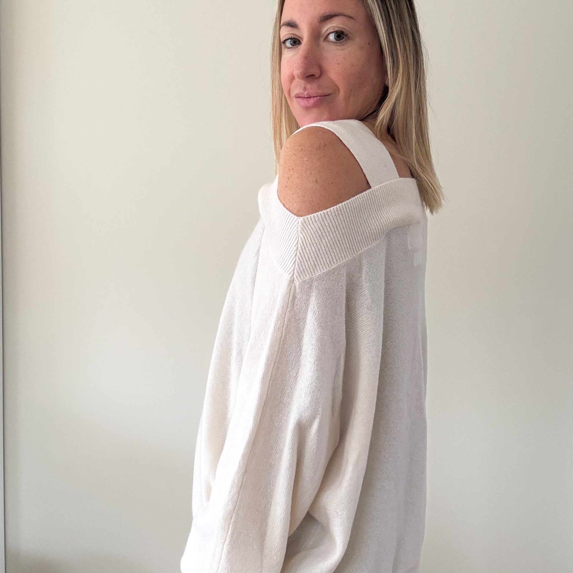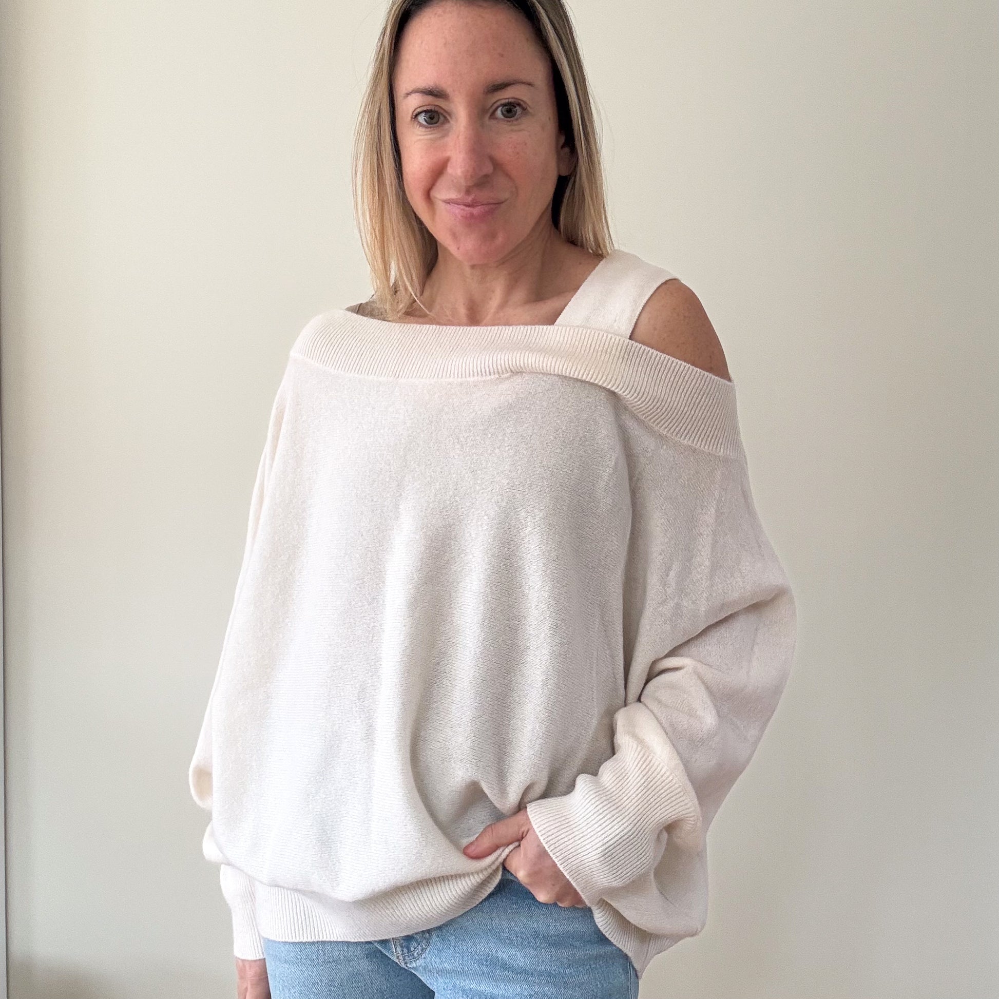 A refined take on modern cashmere, this Colorush cold shoulder jumper blends relaxed elegance with understated sensuality. Crafted in a beautifully soft ivory cashmere knit, the design features a contemporary off-the-shoulder neckline with subtle cold-shoulder detailing, offering a flattering drape that feels both effortless and elevated. Finished with ribbed trims and a fluid silhouette, this piece transitions seamlessly from daytime layering to understated evening wear.