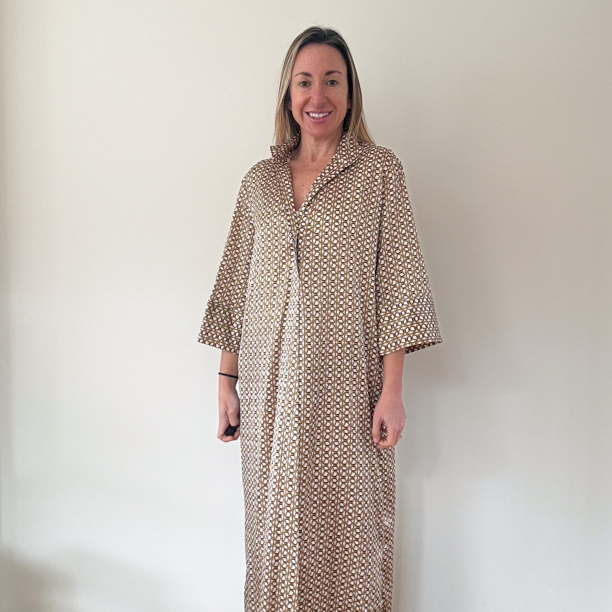 Cut to a relaxed full-length silhouette, this piece features a softly structured shirt collar, concealed button front and wide three-quarter sleeves, creating an effortless balance between tailored polish and fluid movement. The silk drapes beautifully through the body, making it ideal for elevated daytime dressing, travel wardrobes, or understated evening wear.