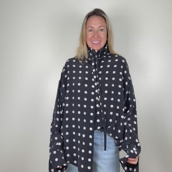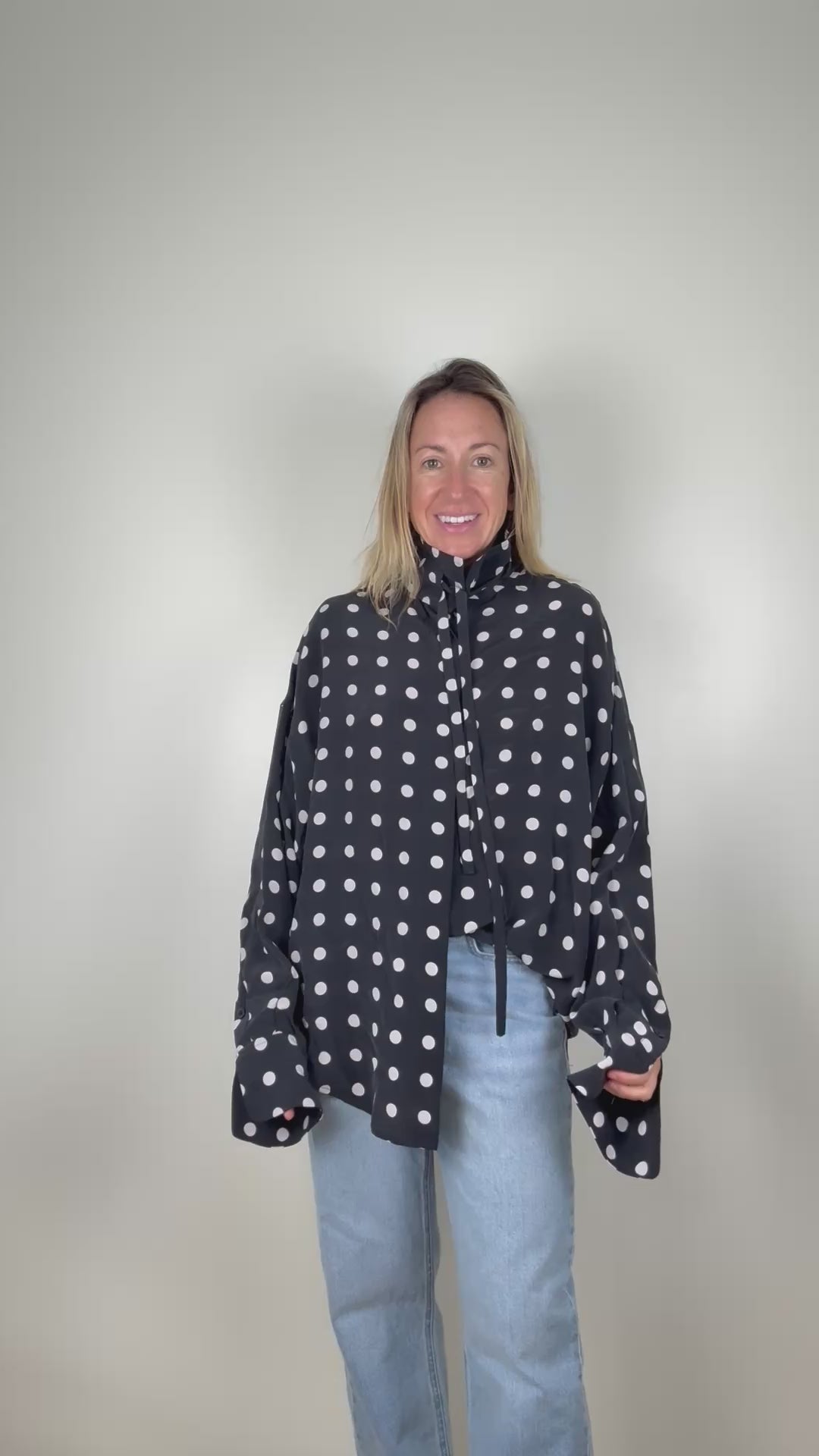 This preloved, immaculate condition silk blouse features a classic polka dot print in an oversized silhouette. With an exaggerated collar that can be worn as a high neck with a tie detail, or as a classic shirt collar, this shirt allows for a huge amount of styling options.