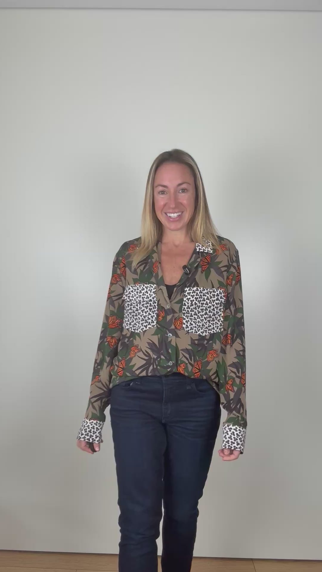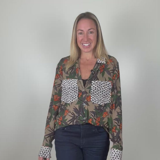 A striking combination of prints sets this shirt apart: a camouflage-inspired botanical backdrop is enlivened with vibrant butterfly motifs, while contrasting animal-print pockets and cuffs add an unexpected, fashion-forward twist. The relaxed silhouette and tailored detailing make it a versatile statement piece — equally striking styled with sharp tailoring or worn loose over denim for an elevated off-duty look.