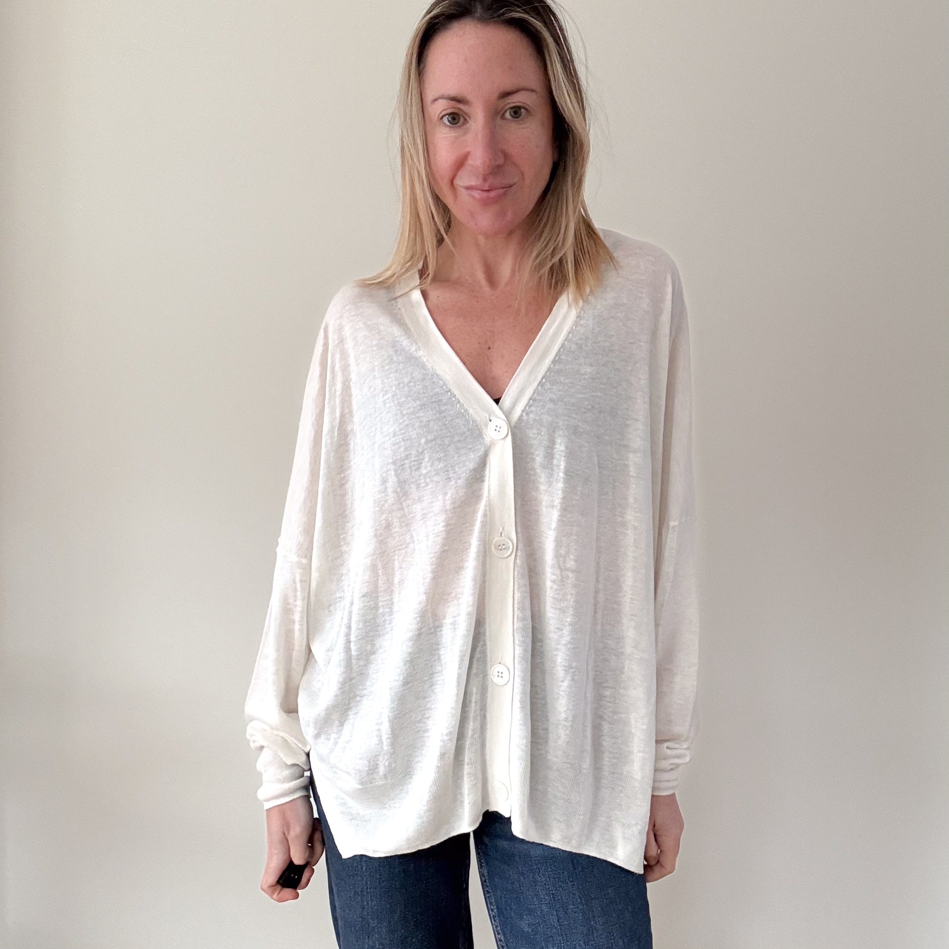 A beautifully understated piece from Estheme Cachemire, this ivory cardigan is crafted from a fine linen blend, offering a lightweight, breathable feel with a softly luxurious handle. Designed with a relaxed silhouette, it features a flattering V-neckline, delicate button fastening and gently dropped shoulders for effortless everyday elegance.