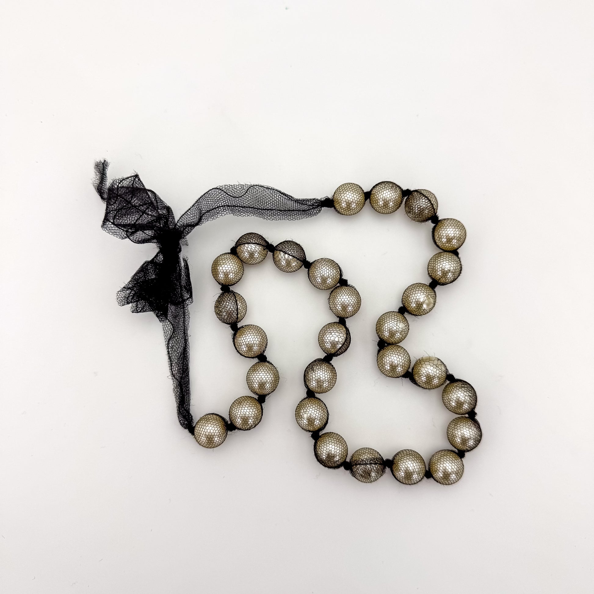 From the era of Alber Elbaz, this striking Lanvin knotted mesh oversized pearl necklace, a signature piece from the house celebrated for its dramatic, couture-inspired accessories is the ideal piece to elevate your jewellery collection. Each luminous pearl is individually wrapped in delicate black mesh and hand-knotted to create a bold yet undeniably elegant silhouette. Finished with a soft black ribbon tie, it offers versatile styling—wear it long, doubled, or as a statement choker.