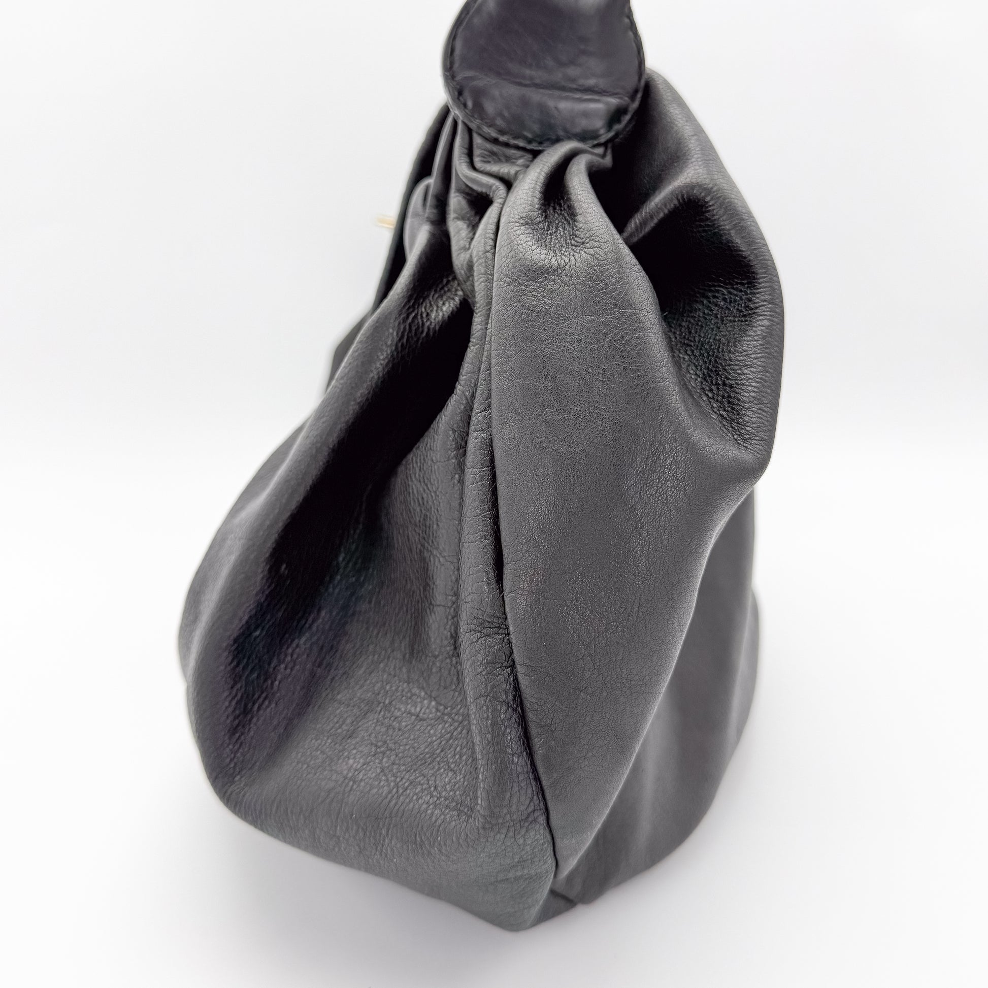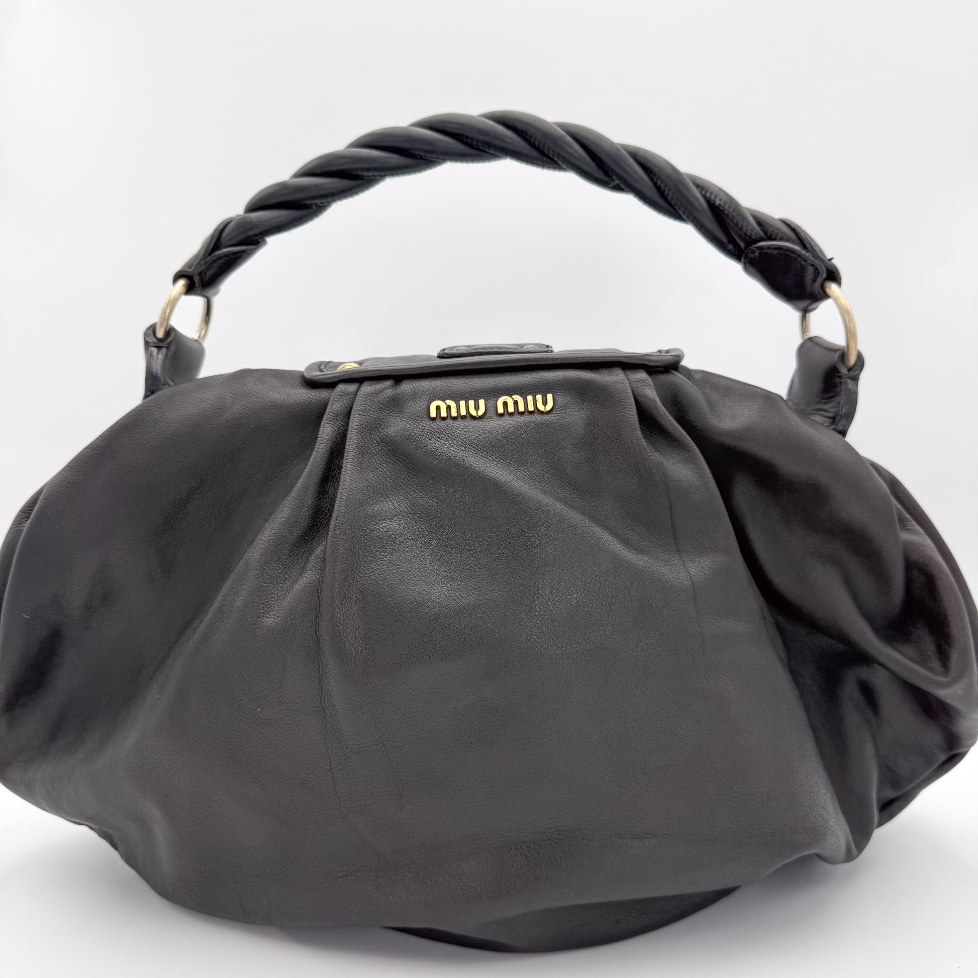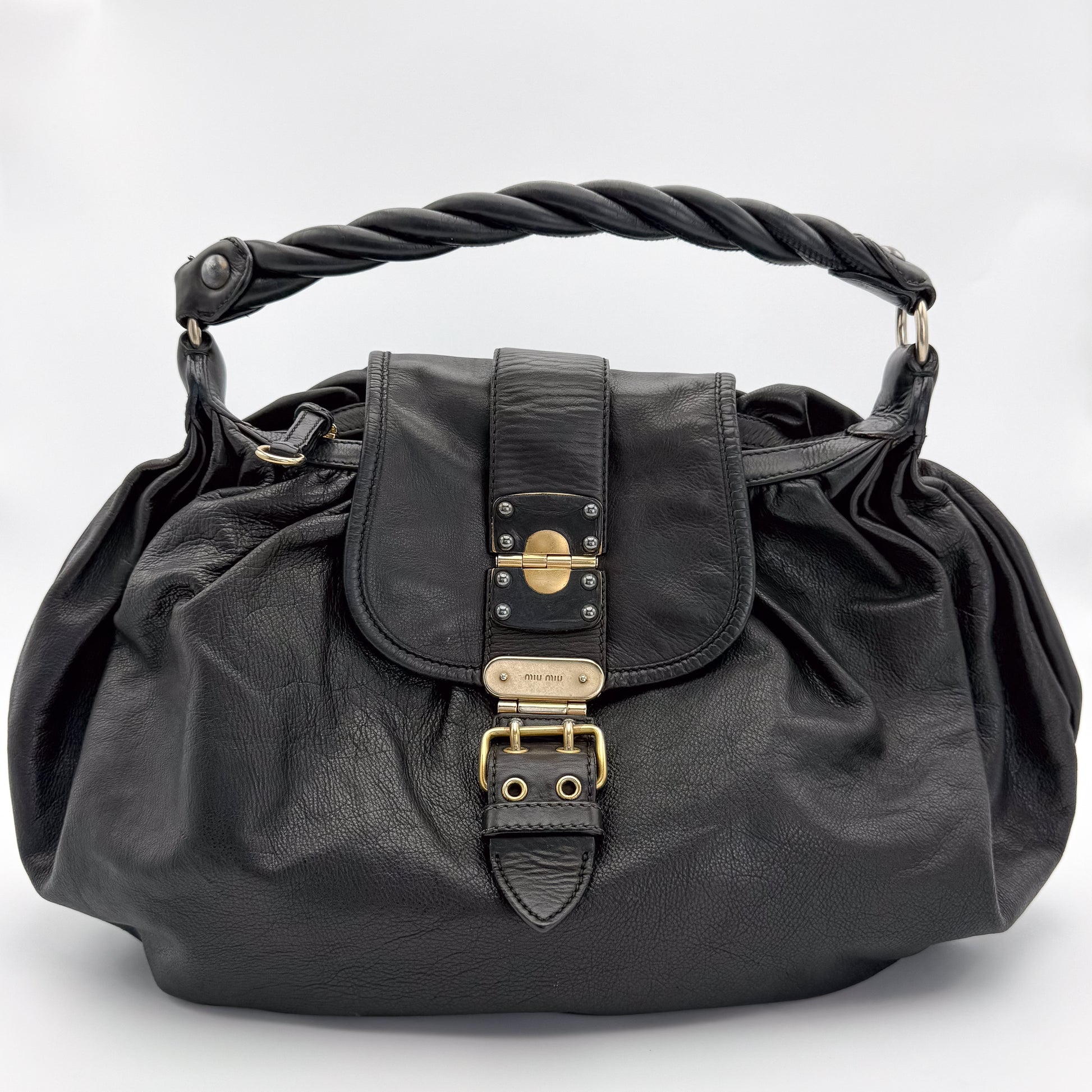 A celebrated icon from Miu Miu’s archives, the Coffer Bag in supple black leather epitomises the brand’s signature blend of femininity and modern edge. Crafted in Italy, this beautifully soft bag features the distinctive ruched detailing and the iconic plaited top handle — hallmarks of Miu Miu’s effortlessly chic aesthetic.