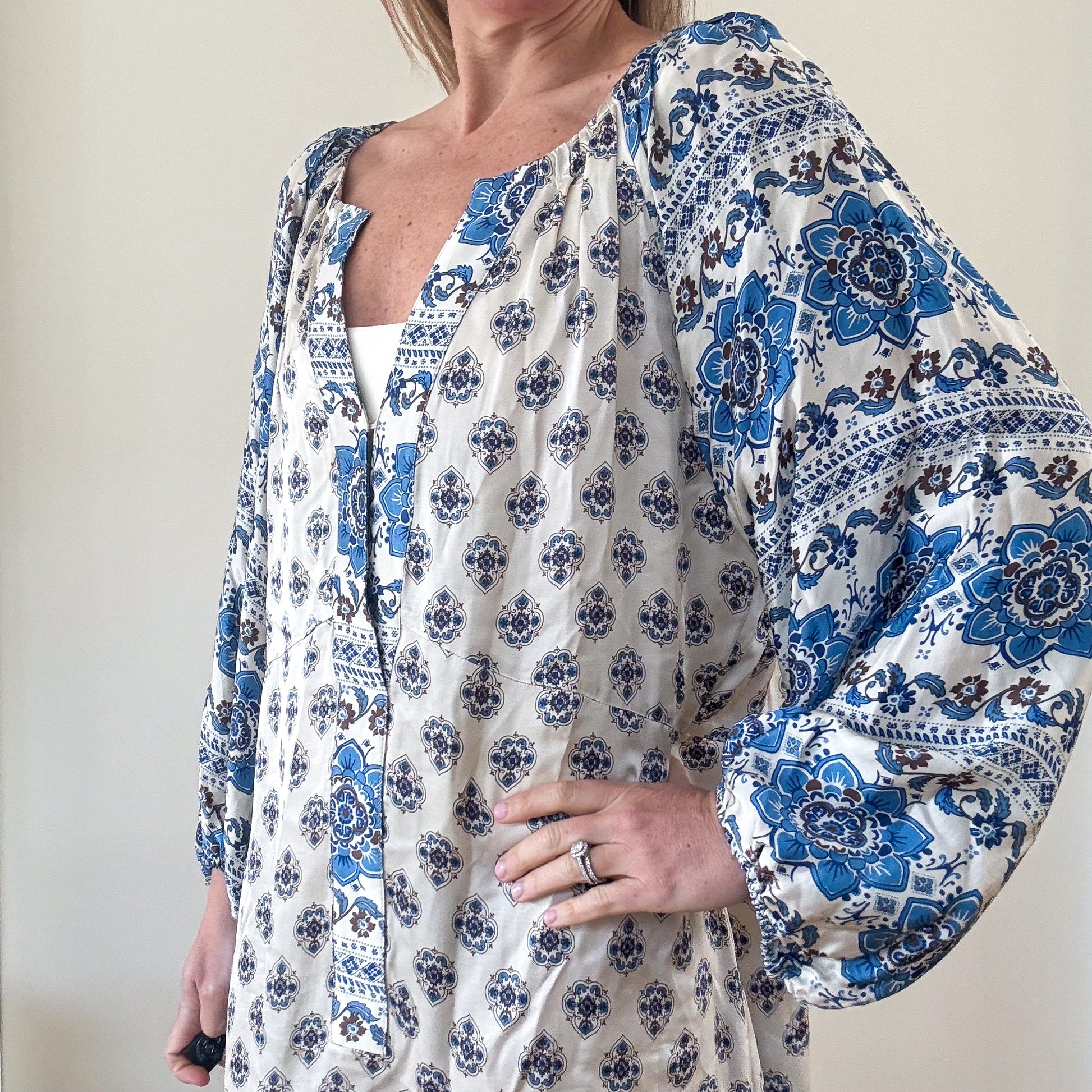 The softly gathered neckline opens into a gentle split front, creating a flattering neckline that enhances the fluid drape of the dress. Long voluminous sleeves with gathered cuffs add softness and shape, while the loose flowing body falls into a graceful maxi length designed for comfort and movement. The contrasting border print along the sleeves and neckline adds subtle definition and elevates the artisanal character of the piece.