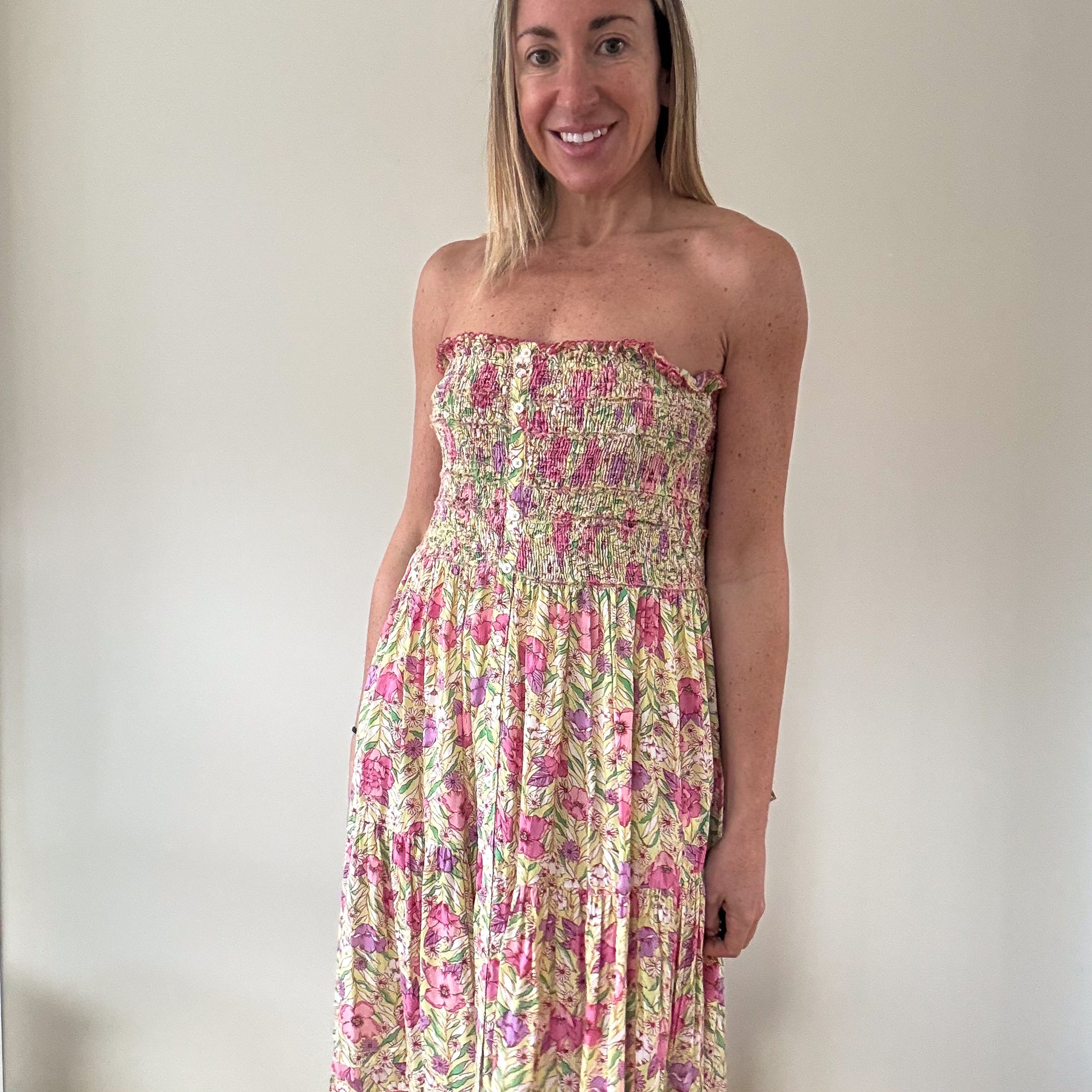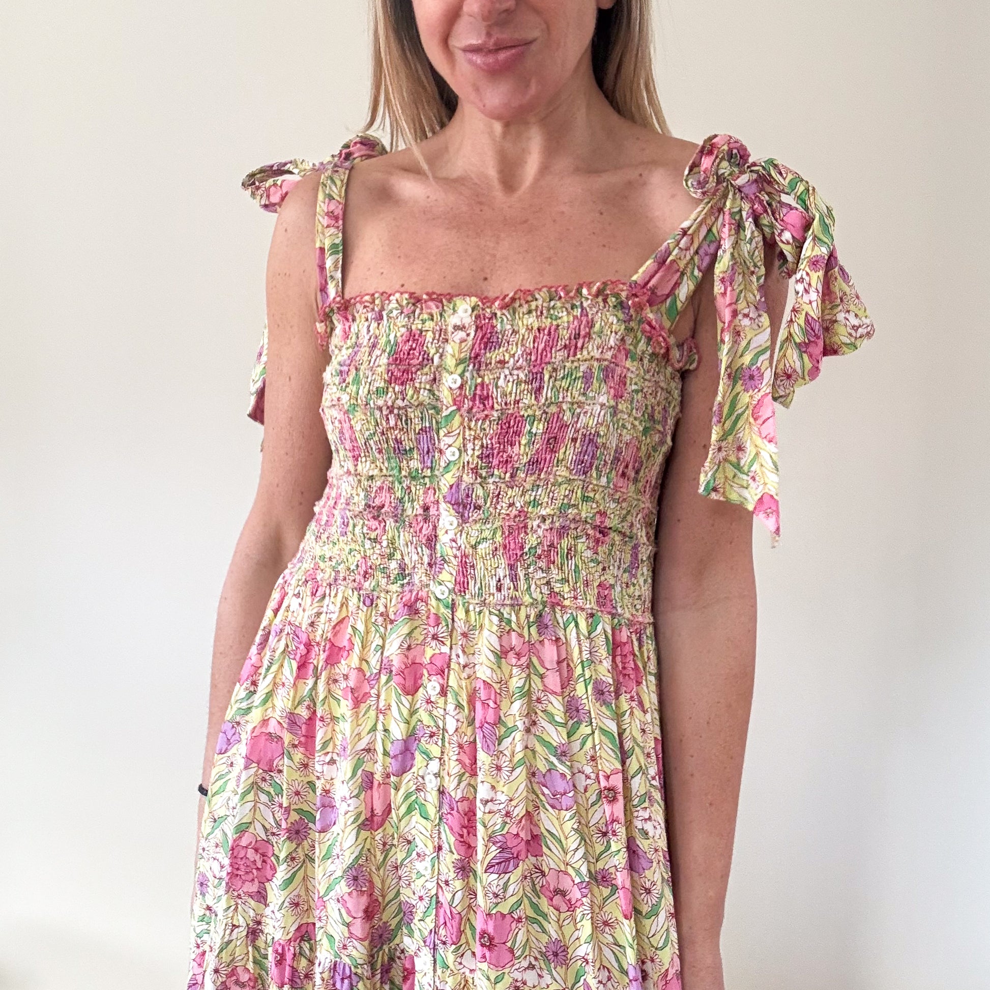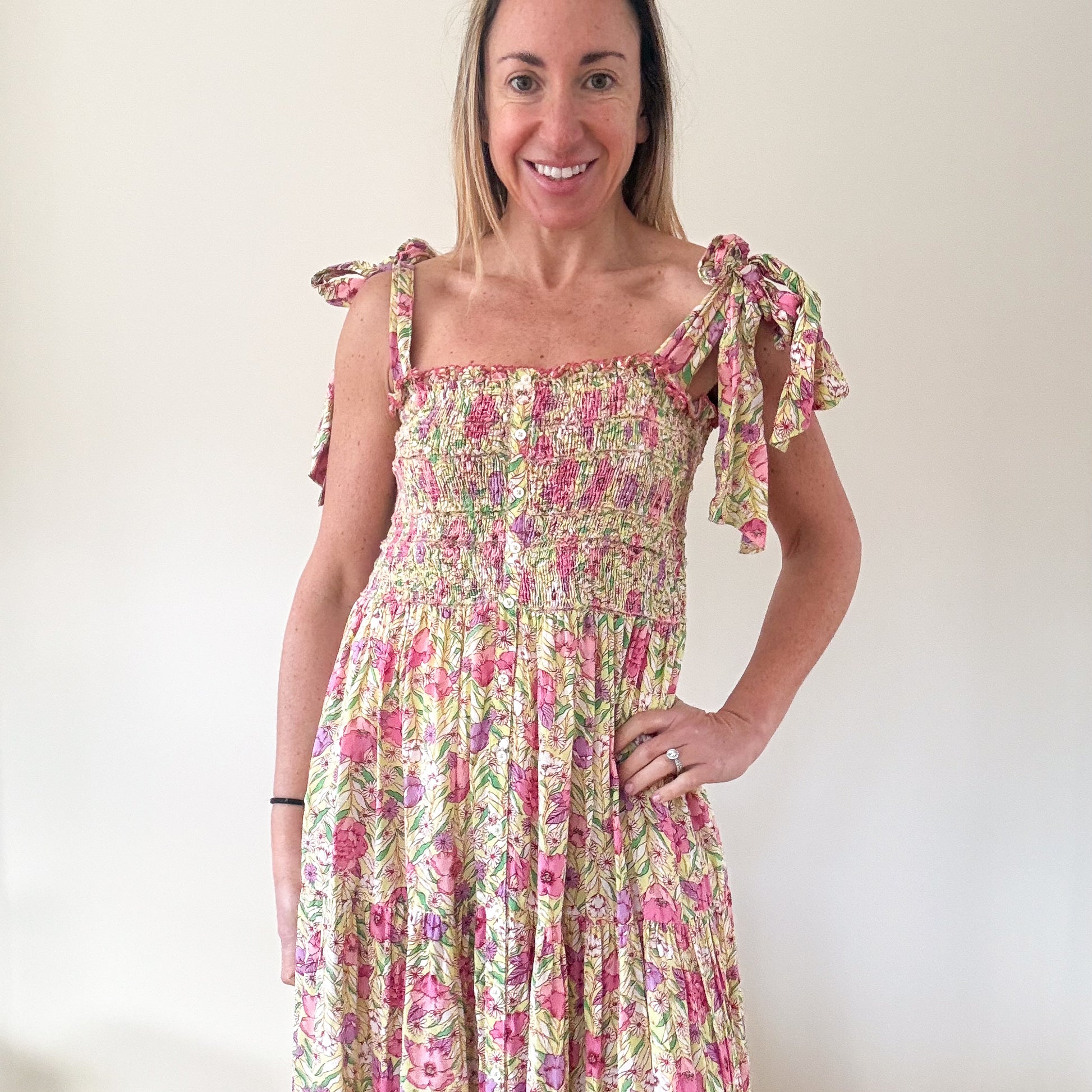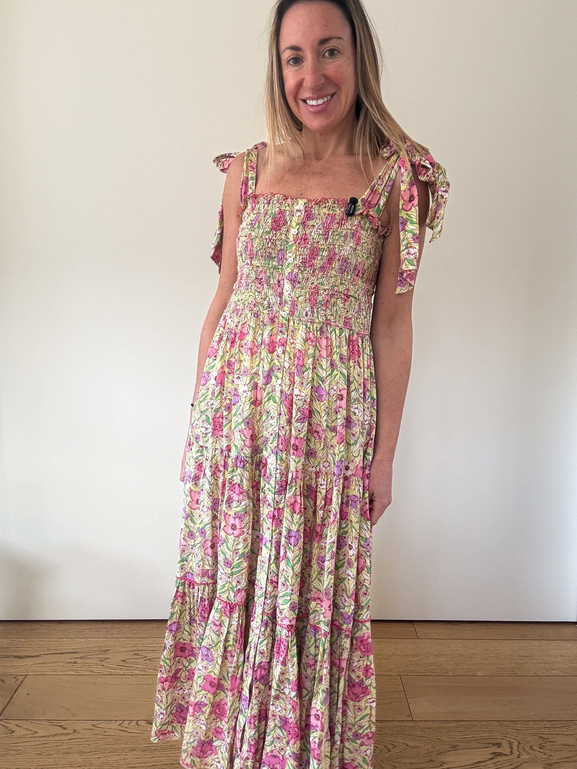 The bodice is beautifully smocked for a flattering, flexible fit through the bust and waist, finished with delicate ruffle edging and a subtle button-front detail. Adjustable (and removable) tie shoulder straps adorned with soft bow ties add a playful, feminine finish while allowing the fit to be customised. Below the waist, the skirt falls into a softly tiered maxi length, creating gentle movement and an airy silhouette ideal for warm-weather dressing.