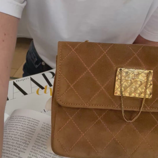 This rare preloved collectors item dates back to 1986, and continues to be a sought after exclusive piece today. With 24 carat gold tone hardware, and a tan walnut colourway, this quilted suede crossbody bag adds an historic elegance to your outfit.