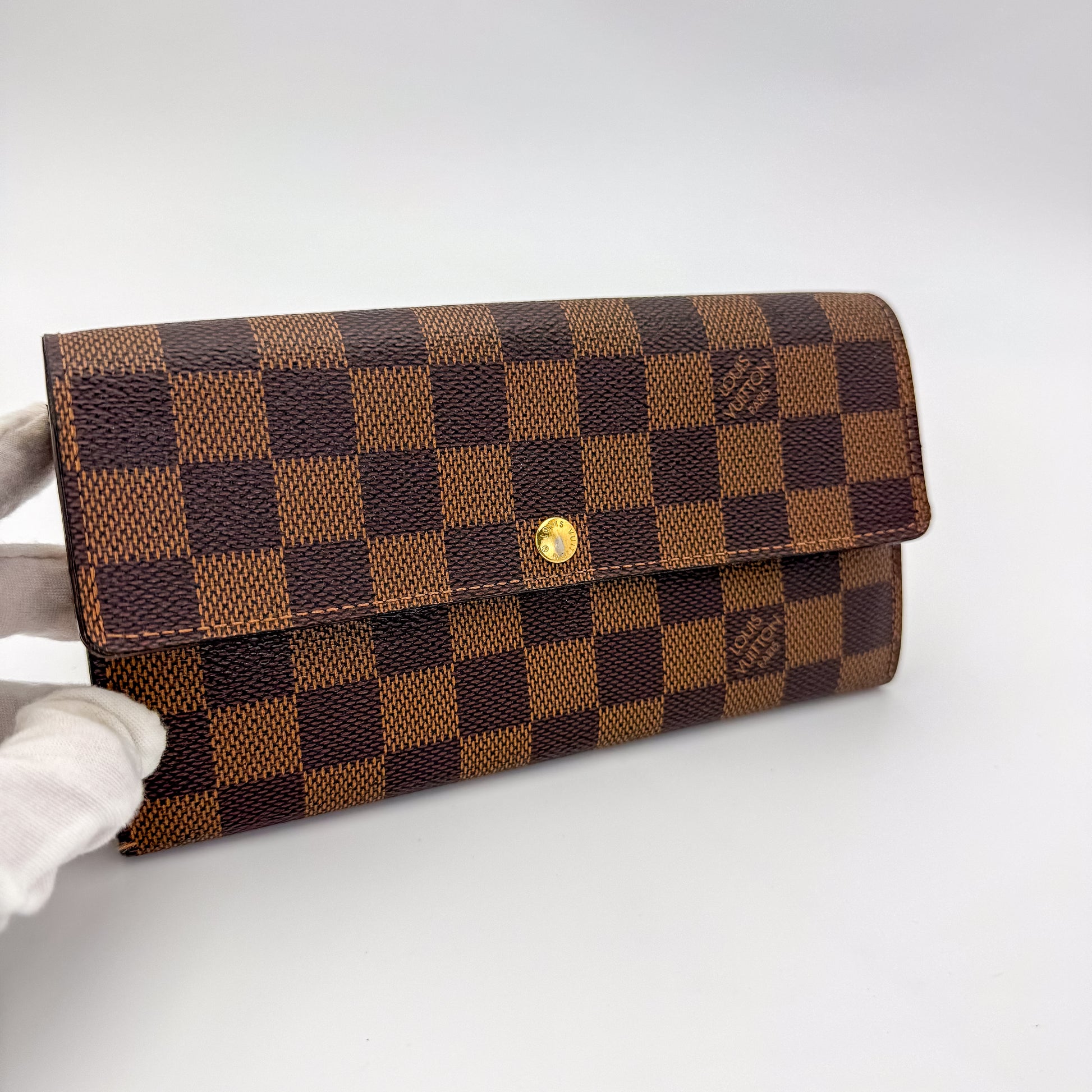 Elevate your everyday essentials with this authentic preloved Louis Vuitton Sarah Wallet in Damier Ebene, a timeless piece crafted from the house’s iconic checked canvas and finished with a rich chocolate-brown leather interior.