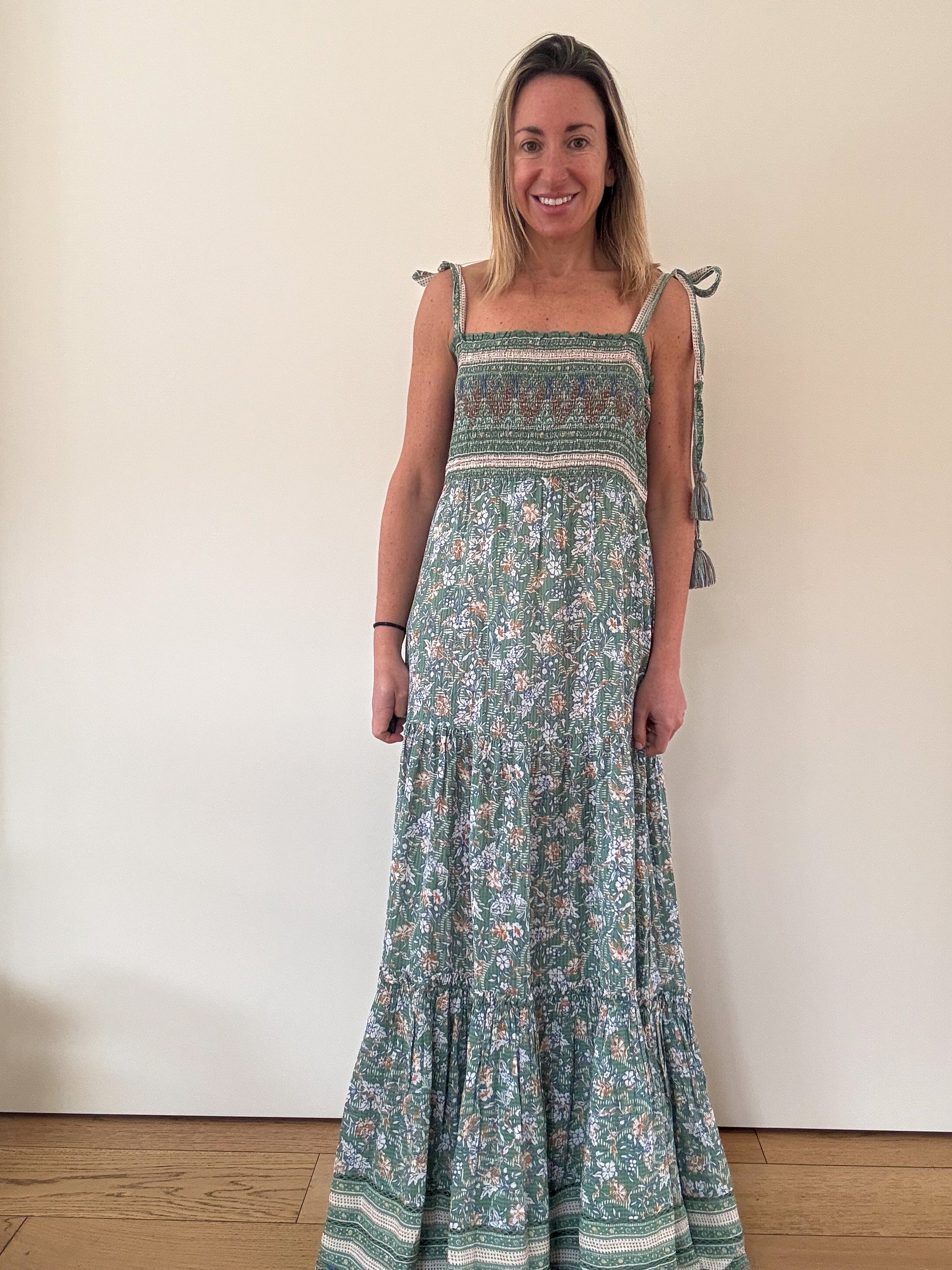The smocked bodice creates a flattering, flexible fit through the torso, while adjustable tie shoulders finished with tassel trims introduce a relaxed bohemian touch. A softly tiered skirt adds movement and volume, balanced by intricate border detailing and a subtle mixed-print composition that reflects Veronica Beard’s signature elevated print work.